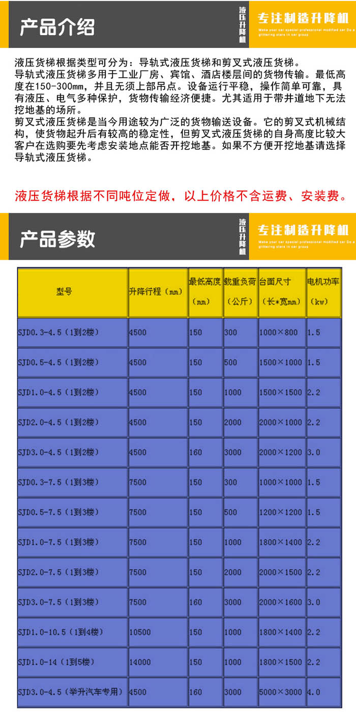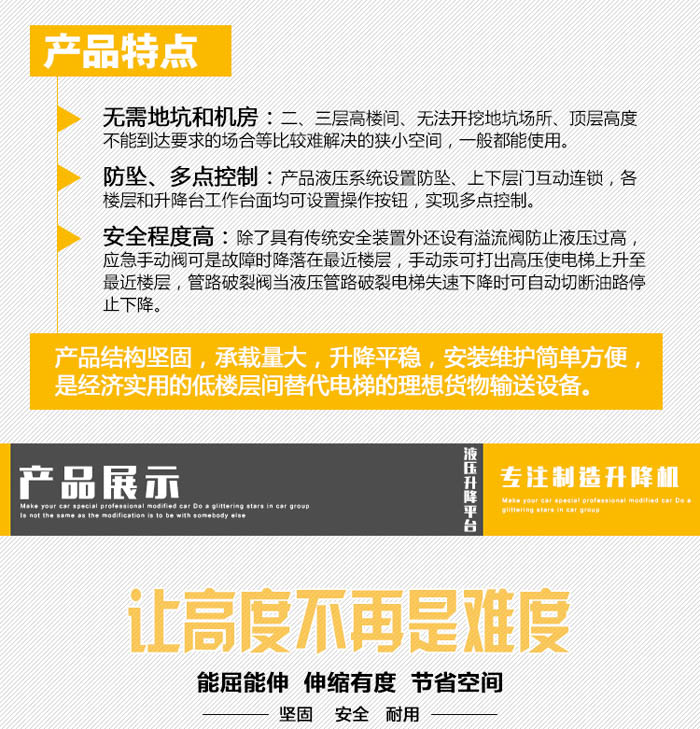 4、設(shè)備可按客戶提供的承載重量、起升高度、平臺尺寸或預(yù)留空間尺寸、使用場所非標(biāo)訂制;